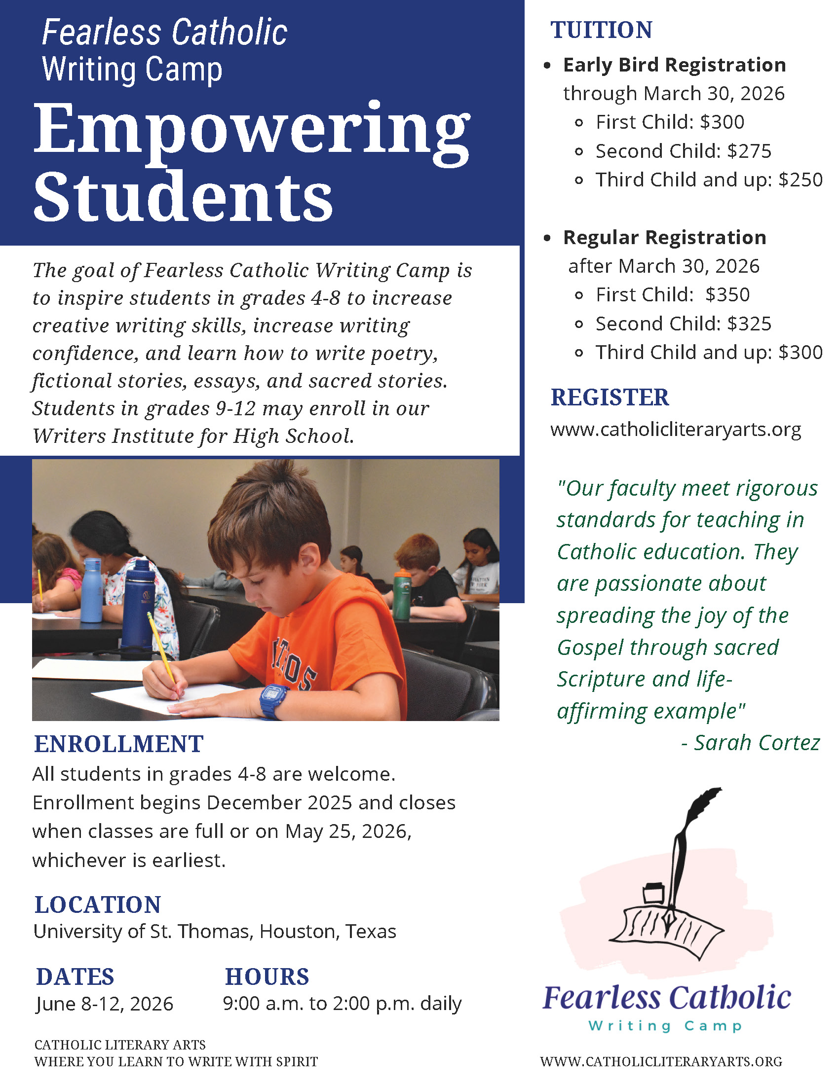 The Fearless Catholic Writing Camp helps young writers grow in creativity and confidence through hands-on lessons in fiction, poetry, sacred stories, and creative nonfiction. Students learn to analyze texts, explore deeper meanings, and develop practical writing and revision skills. By the end of the week, they’ll discover the joy and freedom of expressing their ideas on the page.